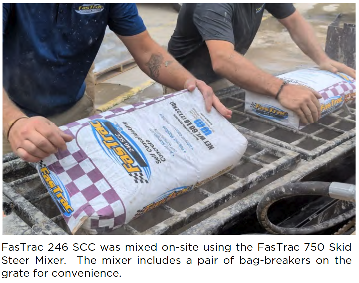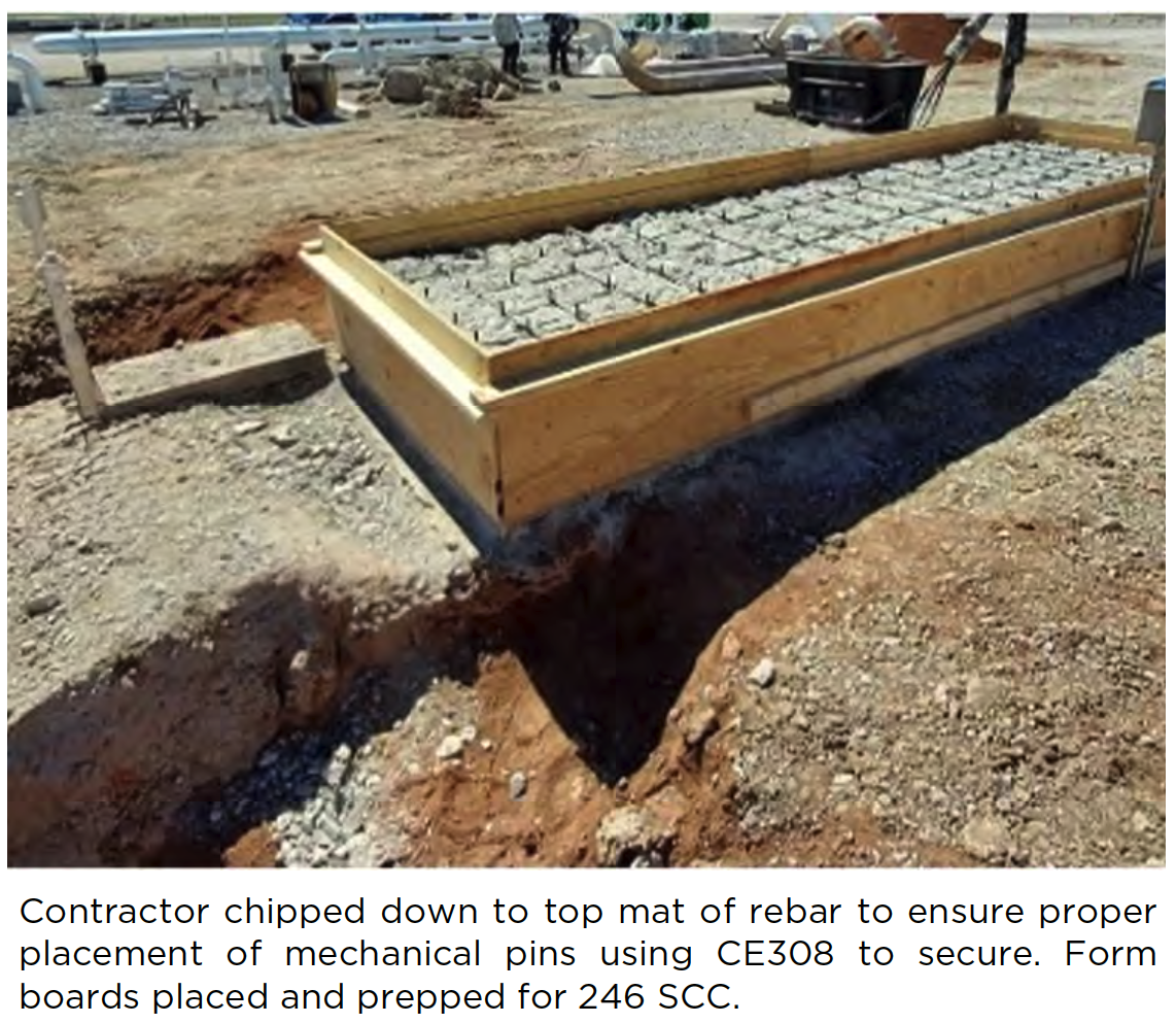 d) Lower Risk of Formwork Damage – The sooner forms can be safely removed, the less chance they are damaged by prolonged exposure to pressure, weather, or site traffic. Fill Around Anchors – 246 SCC flows freely into congested reinforcement and around anchor bolts without the need for vibration, giving a more reliable bond and support.